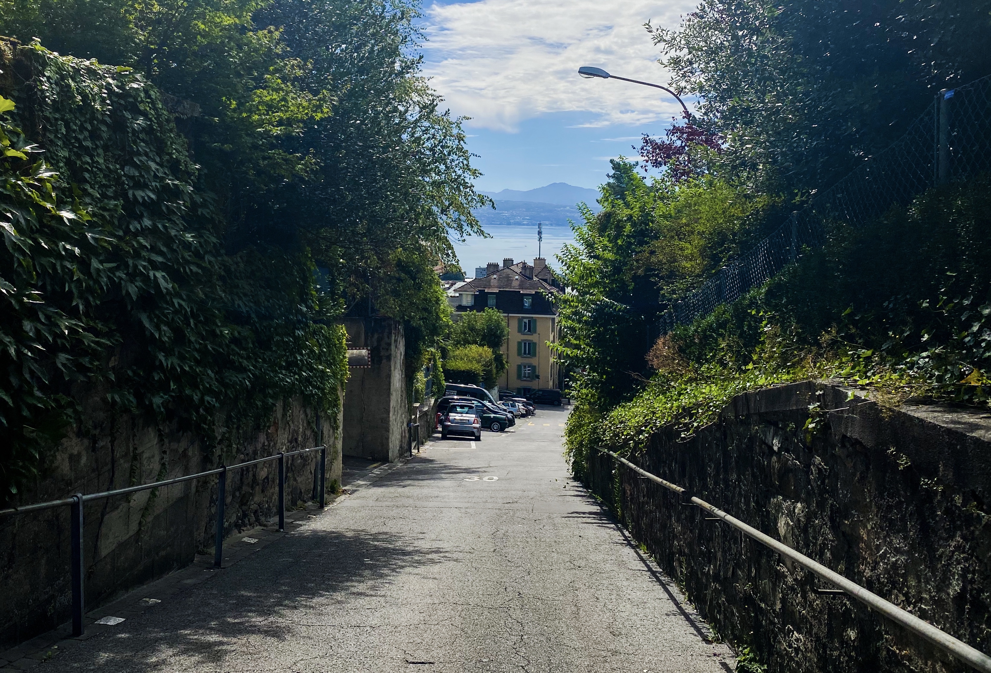 그래서 가끔 뒤돌아 보면 건물이나 나무 사이로 레만호랑 산들이 보이곤 한다.